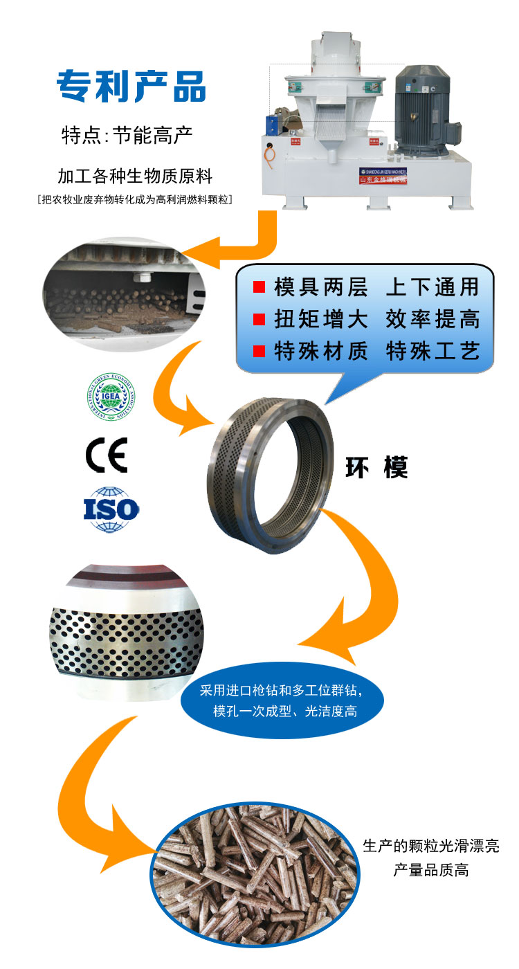 工作時生物質木屑原料由進料口垂直落入,經過壓輪的旋轉使物料連續均布在模具內腔表麵(壓輥與模具的接觸立麵),在壓輥的碾壓下粉狀物料穿過模具的孔(均布在模具內表麵的孔)。此過程物料受到高壓、高溫的作用,產生物理變化或適當的化學變化(根據物料),促使粉狀物料形成不斷加長的圓柱狀實心體,再由斷刀切斷顆粒,從出料口排出,至此顆粒的壓製過程完成。