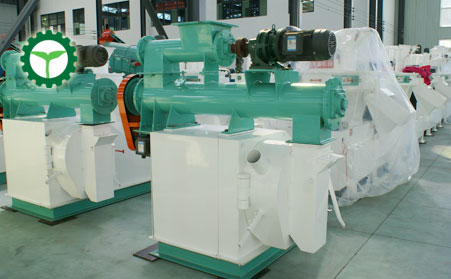 工作時生物質木屑原料由進料口垂直落入,經過壓輪的旋轉使物料連續均布在模具內腔表麵(壓輥與模具的接觸立麵),在壓輥的碾壓下粉狀物料穿過模具的孔(均布在模具內表麵的孔)。此過程物料受到高壓、高溫的作用,產生物理變化或適當的化學變化(根據物料),促使粉狀物料形成不斷加長的圓柱狀實心體,再由斷刀切斷顆粒,從出料口排出,至此顆粒的壓製過程完成。