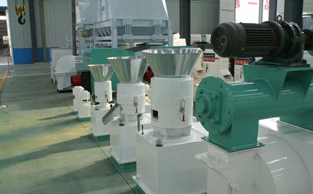 帶動皮帶輪傳遞到主軸及平模擦動壓輪使壓輪與模板之間有大於80℃的磨擦溫度,是以機械圓運動為基礎,粉料通過高溫糊化凝結,在壓輪的擠壓下,從平模孔中擠出,經過切刀的分段,最後從下料口中滾出顆粒飼料,電動機及柴油機為動力,顆粒飼料自然冷卻後才可包裝。