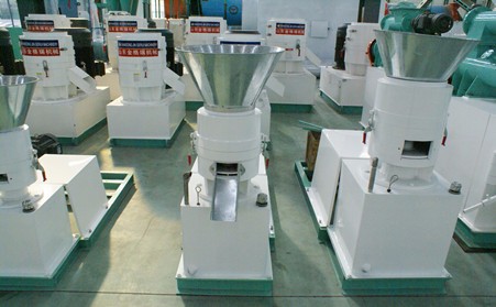 采用模板、壓輥采用優質合金鋼經特殊處理,飼料機主軸及平模在摩擦力作用下,帶動壓輥自轉,壓輥與模板產生高溫使澱粉熟化,蛋白質變性凝固,在壓輥擠壓下從模孔中排出,小型飼料機顆粒經甩料盤送出機外,通過調節切刀角度可控製顆粒飼料的長短。